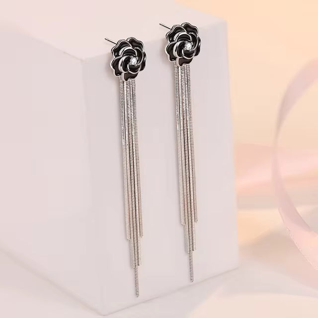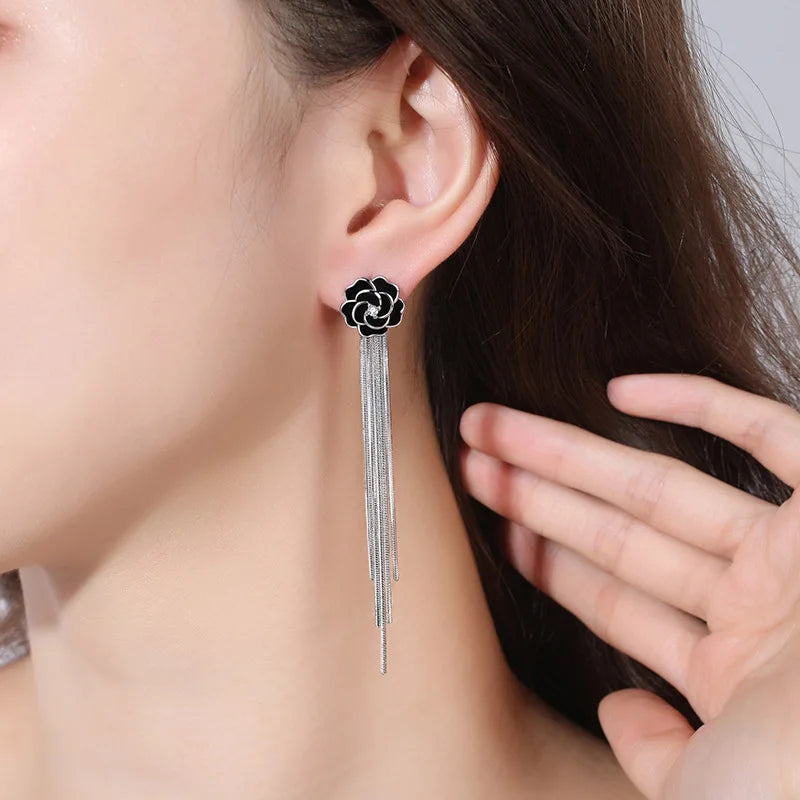 These 925 sterling silver black rose fringed long earrings embody dark romance and refined elegance. Featuring a delicately crafted black rose as the centerpiece, the design flows into graceful fringe accents that sway with every movement. Perfect for engagements, evening events, or adding a mysterious charm to everyday wear, they combine high-quality sterling silver with a strikingly unique design.